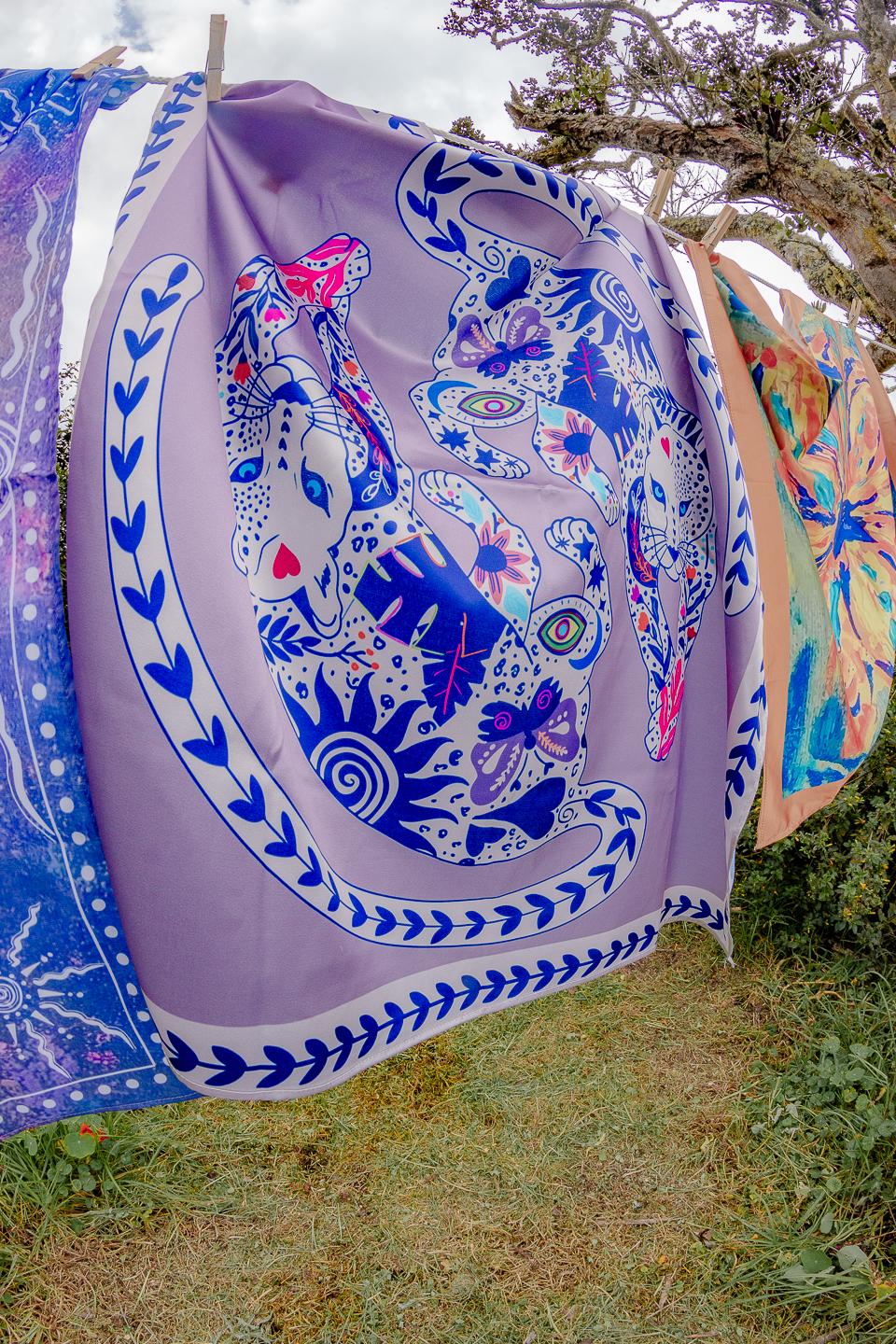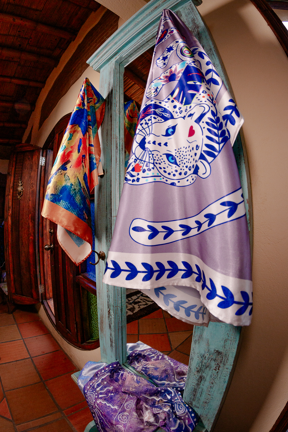 Descubre la elegancia y el arte de nuestras pañoletas de seda, una celebración de color y creatividad. Cada pañoleta está estampada con obras de arte y diseños digitales hechos a mano, convirtiéndolas en piezas exclusivas que destacan por su vibrante paleta de colores.